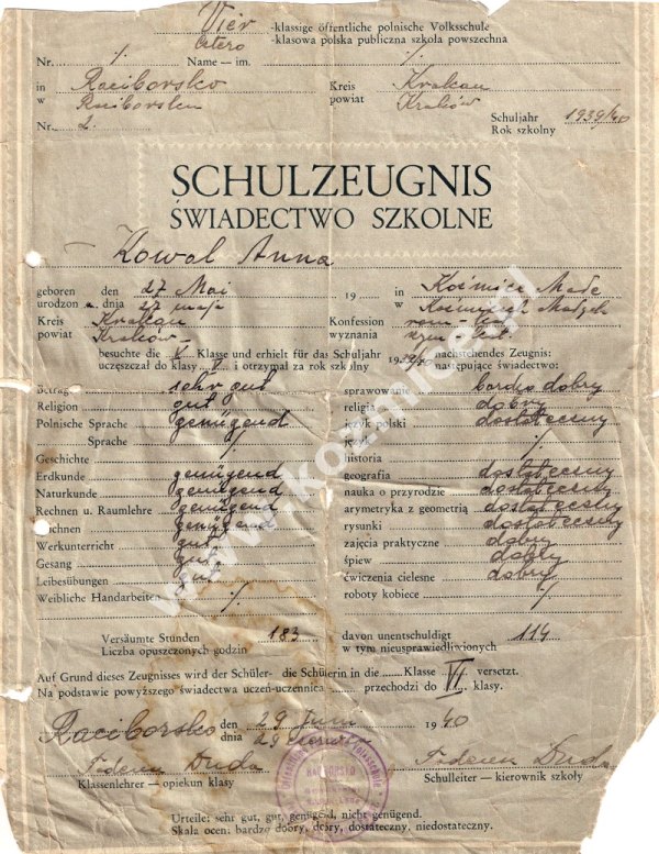 ![]() ![]() Te dwa zdjęcia wydają się mieć związek ze szkołą w Raciborsku w interesującym nas okresie. Zdjęcie po lewej, nadesłane przez S.Dziedzica zostało zrobione w Raciborsku około roku 1930. Jedyną rozpoznaną osobą na nim jest Ludwika Surówka (pierwsza z prawej) późniejsza siostra Immakulata. Drugie zdjęcie pochodzi ze strony www.raciborsko.cba.pl i prawdopodobnie zostało wykonane około roku 1940-tego. Opracował: Andrzej Pasula. Dziękuję: Piotrowi Kaczorowi za udostępnienie kopii Kroniki szkoły w Raciborsku, Janu Kowalowi za pomysł, informacje oraz kopię świadectwa z 1940 roku,Sylwii Stanek za zdjęcie oraz uzyskanie informacji od babci - Rozalii Stanek a także Michałowi Wiechniakowi za informacje. Zobacz także: Zdjęcie ze szkoły w Koźmicach, rok 1935. sierpień 2008