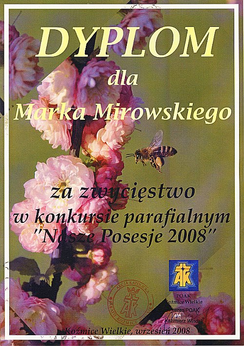Rozstrzygnięty został, organizowany po raz pierwszy, prafialny konkurs ogrodniczy. Zwycięzcą konkursu został Marek Mirowski z Koźmic Małych, którego piękny ogród prezentowaliśmy w czerwcu. 17 września nagroda pieniężna w wysokości 300 zł została wręczona przez organizatora konkursu - Prezesa koźmickiej Akcji Katolickiej - Kazimierza Windaka a gratulacje Panu Markowi złożyli członkowie komisji konkursowej: