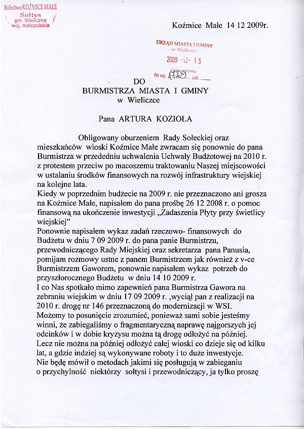 Grudzień to między innymi okres domykania gminnego budżetu. Urzędnicy przygotowują grzecznym podatnikom "prezenty pod choinkę". Co dostają Ci niegrzeczni to każdy chyba pamięta z dzieciństwa. Początek zimy skąpo śniegiem poprószył i podobnie Rada Miejska w Wieliczce skapnęła groszem na świetlicę w Koźmiczkach. Dostaliśmy kwotę, która pozwoli na dokończenie budowy zadaszenia nad Nasalówką. Pieniądze zostaną przeznaczone m.in. na wykonanie instalacji odgromowej oraz piaskowanie i malowanie konstrukcji stalowej. O tą kasę nasz sołtys walczył do samego końca ! Przeczytaj pismo poniżej (kliknij):