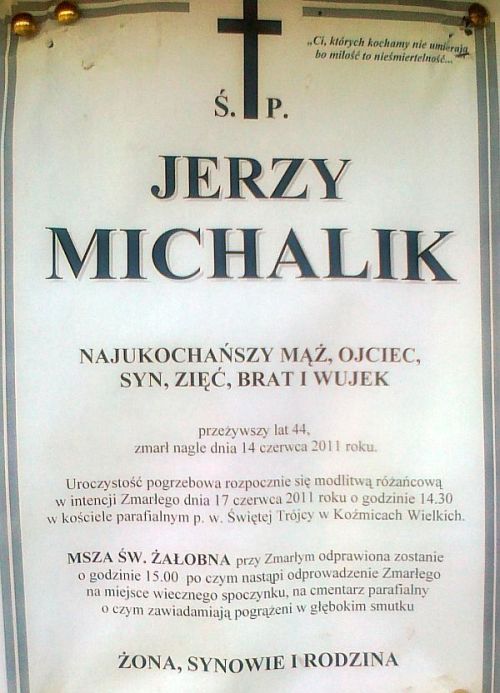 Zmarł Jerzy Michalik 14 czerwca 2011 r w wieku 44 lat zmarł nagle Jerzy Michalik. Msza św. żałobna odprawiona została 17 czerwca o godz. 1430 w kościele parafialnym w Koźmicach Wielkich, po czym nastąpiło odprowadzenie Zmarłego na miejsce wiecznego spoczynku. Nekrolog. czerwiec 2011