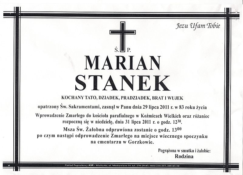 Zmarł Marian Stanek 29 lipca 2011 r w wieku 83 lat zmarł Marian Stanek. Nabożeństwo żałobne odprawione zostało 31 lipca o godz. 1230 w kościele parafialnym w Koźmicach Wielkich, po czym nastąpiło odprowadzenie Zmarłego na miejsce wiecznego spoczynku na cmentarz w Gorzkowie. Nekrolog. lipiec 2011