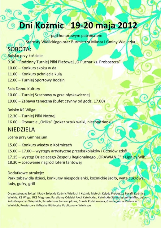 Ogłoszenie Sołtysa![]() Zwracam się do młodzieży żeńskiej i męskiej Naszej wioski oraz do wszystkich mieszkańców, o liczny udział w sobotę 19 maja na turnieju piłki nożnej na boisku sportowym KS Wilga w celu kibicowania drużynie Koźmiczek w walce o pierwsze miejsce w turnieju. Serdecznie zapraszam, Sołtys Stanisław Dziedzic maj 2012